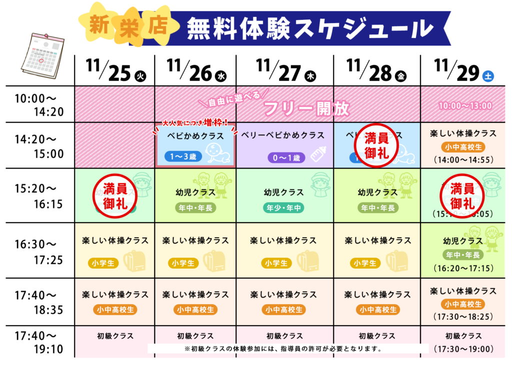お子様の年齢に合わせて、ご希望の体験クラスをご予約ください。